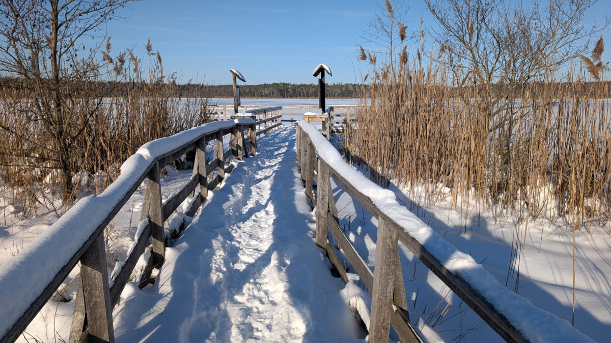 Piękne słońce w weekend skusiło nas do wycieczki. Od paru dni nie pada śnieg, co dało szansę drogowcom i faktycznie czarna nawierzchnia wśród zaśnieżonych pól i lasów towarzyszyła nam z Lublina przez Łęczną i Cyców do Urszulina. Dalej było gorzej, bo z wyślizganym śniegiem i płatami lodu, ale przejezdnie. Prowadzącą do jeziora Moszne ścieżkę Poleskiego Parku Narodowego Dąb Dominik odwiedzaliśmy wielokrotnie wiosną, latem, czy jesienią, ale nigdy PRAWDZIWĄ zimą. Do ostatniej soboty 17.01.2026!