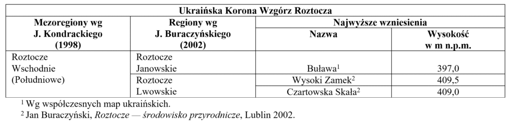 Natomiast w przypadku Roztocza Lwowskiego – według przedwojennej mapy – najwyższe są: Czartowska Skała (414 m n.p.m., na zdjęciu poniżej) oraz Wysoki Zamek (413 m n.p.m.). Jeżeli jednak weźmiemy pod uwagę współczesne opracowania ukraińskie, to okaże się, że wzniesienia te są nieco niższe, przy czym wyższy jest Wysoki Zamek (409 m n.p.m.), a druga jest Czartowska Skała (401 m n.p.m.). Znawca Roztocza, Jan Buraczyński, podaje następujące dane: Wysoki Zamek 409,5 m n.p.m., Czartowska Skała 409 m n.p.m.
